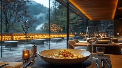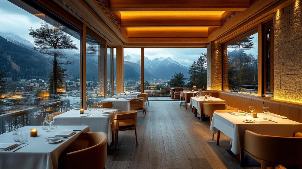 Das Interieur des Restaurants wurde mit viel Liebe zum Detail gestaltet, um eine warme und einladende Atmosphäre zu schaffen. Die Kombination aus natürlichen Materialien wie Holz und Stein mit modernen Design-Elementen schafft einen harmonischen Raum, in dem Sie sich rundum wohlfühlen können. Der Panoramablick auf die umliegenden Berge ergänzt das kulinarische Erlebnis perfekt und sorgt dafür, dass jeder Besuch in der "AlpenKulinarik" zu einem besonderen Ereignis wird.
