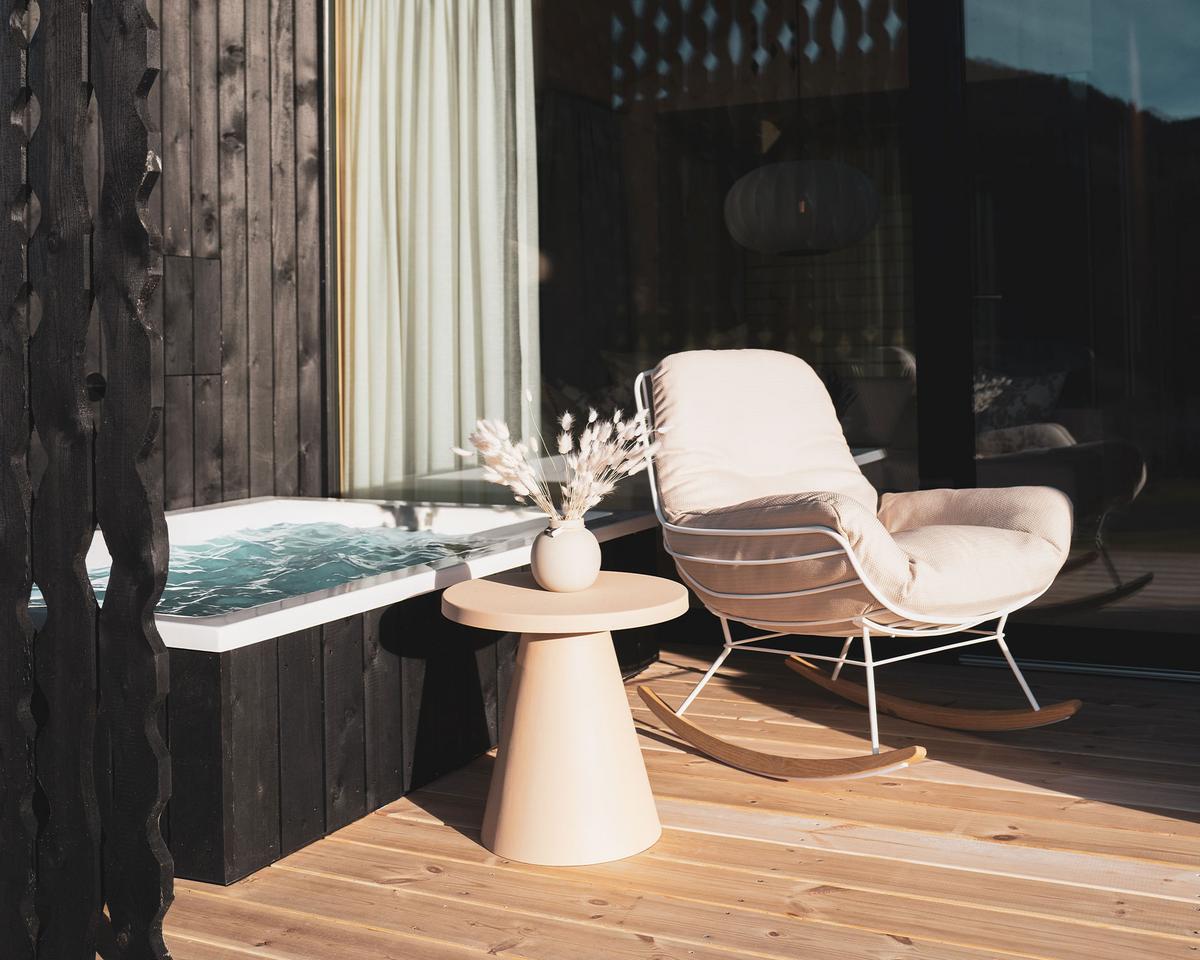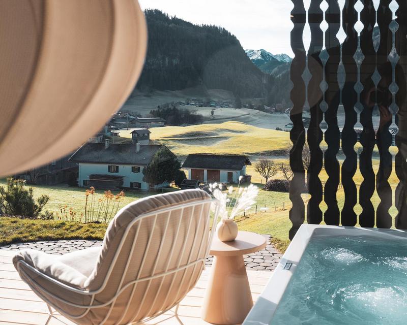 Auf jeder Loggia wartet ein besonderer Ort des Wohlgefühls – die eigene Outdoor-Whirlwanne. Hier sprudelt das Wasser zu jeder Jahreszeit, sanft massierend, wärmend, einladend. Im Sommer schweift der Blick über sattes Grün und blühende Wiesen, im Winter glitzert die klare Bergwelt im Schnee.